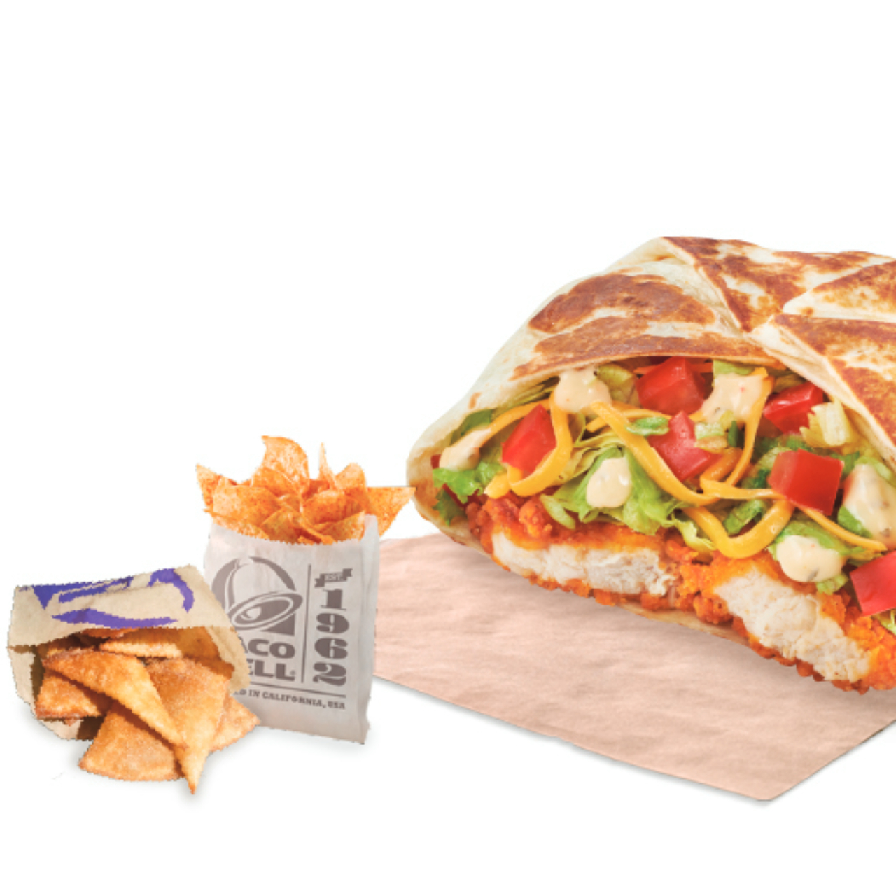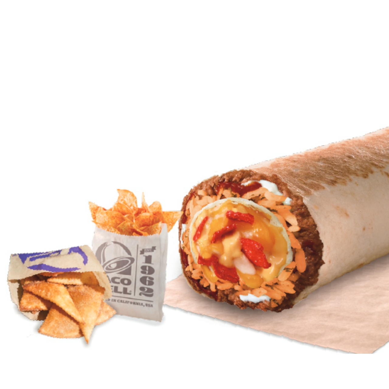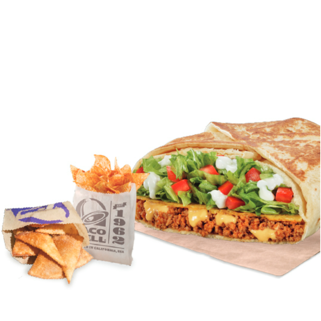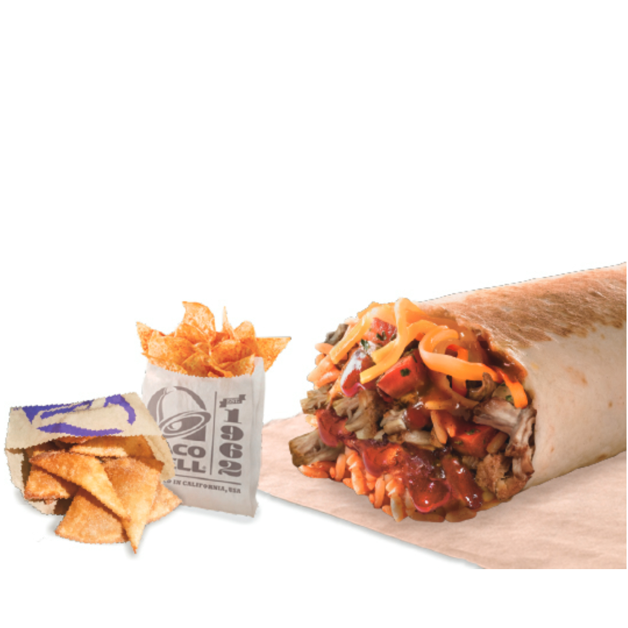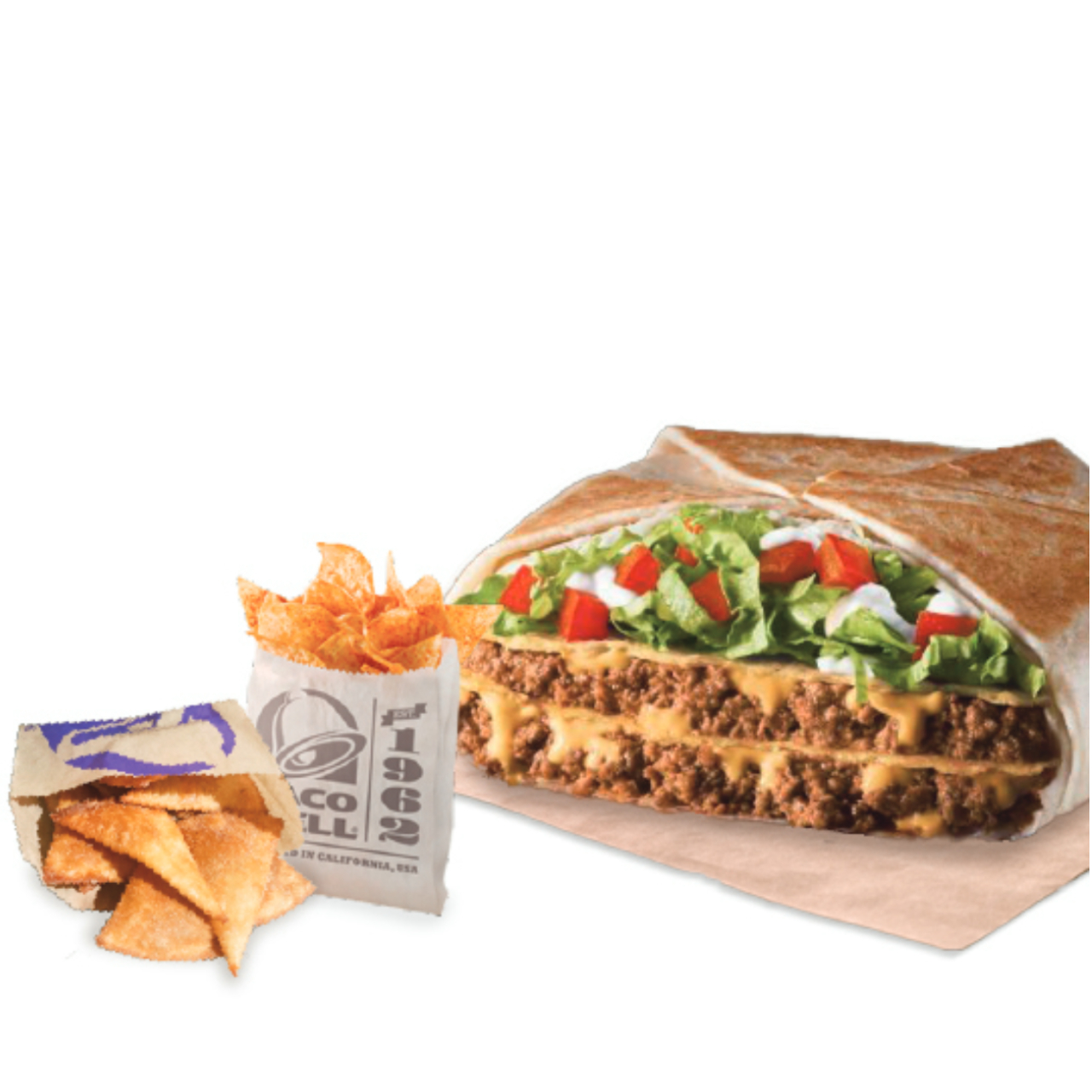 チーズ、野菜、タコビーフ、サワークリームをトルティーヤで包んだタコベル好きの定番! ナチョチップスとシナモンツイスト(シナモンシュガーをまぶしたサクサクデザート)とセットで、更に食べ応え抜群!