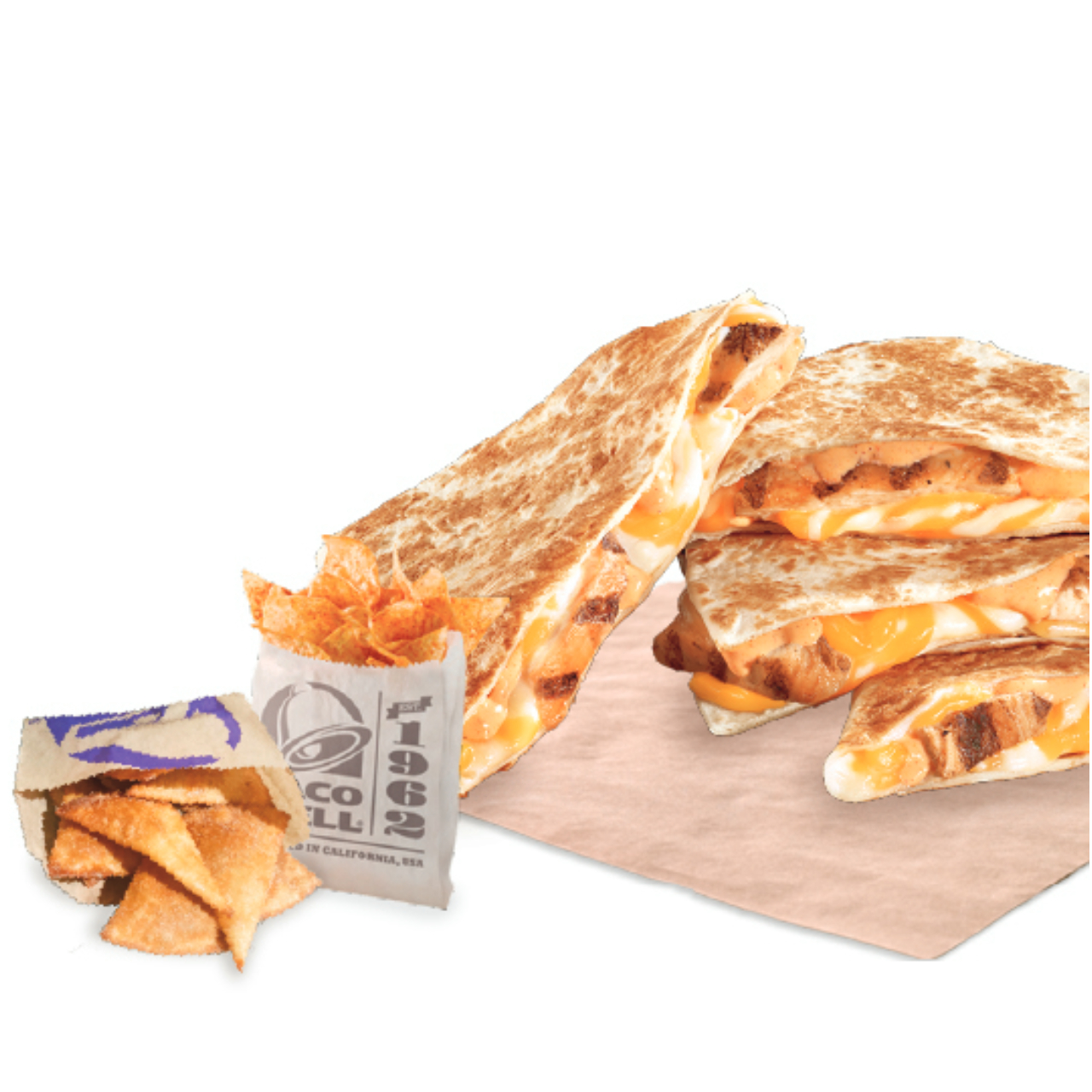 チーズとお肉をトルティーヤで挟んだ人気メニュー。クリーミーハラペーニョソースで濃厚さアップ! ナチョチップスとシナモンツイスト(シナモンシュガーをまぶしたサクサクデザート)がついた充実セット。