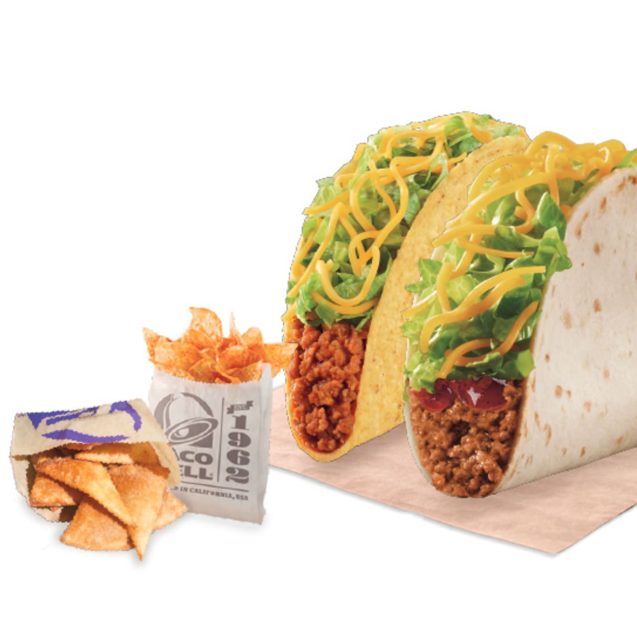 定番タコスを楽しむならこれ!クランチとソフトのシェルが一つずつ。ナチョチップスとシナモンツイスト(シナモンシュガーをまぶしたサクサクデザート)がついた充実セット♪